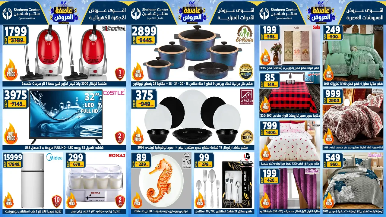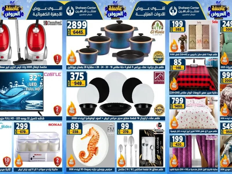 عروض سنتر شاهين الجديدة و ذلك من اليوم 15 يناير حتى 21 يناير 2026 عاصفة العروض او حتى نفاذ الكمية فى جميع فروع سنتر شاهين